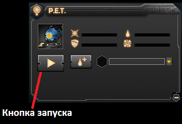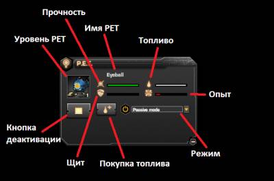 В окошке PET отображается его прочность (Hitpoints), Щит (Shield), Уровень PET (Level), Топливо (Fuel), Опыт до повышения в уровне (Expirience). Так же есть кнопки запуска/выключения PET, покупки топлива и выбора режима.