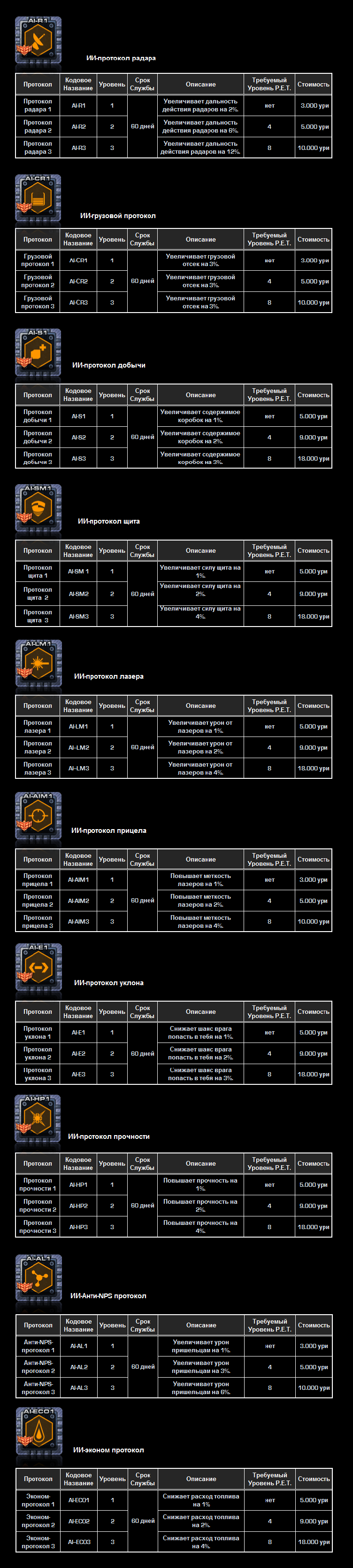 Есть в общей сложности 10 разных протоколов, так же с 3 уровнями производительности. Каждый уровень увеличивает бонус протокола.